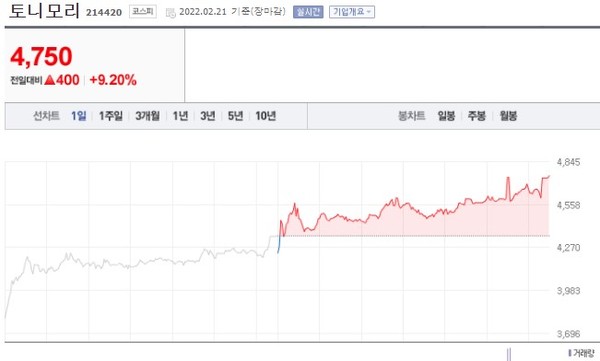 토니모리가 400원(9.20%)로 가장 많이 상승했다. 지난 16일부터 4일 연속 상승하면서 4,750원으로 거래를 마쳤다. 이 종목은 국내 핵심 판매채널인 오프라인 로드샵(가맹점)의 지속적인 위축과 중국 시장 진출 부진이 겹쳐있다. 또 중국 특수때는 저렴한 가격과 독특한 용기 디자인으로 주목을 받았다. 최근 염모용 샴푸를 개발하고 있는 것으로 알려지고 있다.